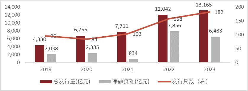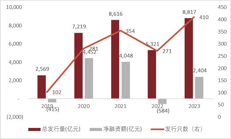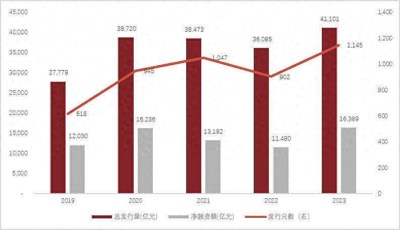 2023年,金融债发行量4.11万亿,净融资量1.64万亿元,同比增长5016亿元和4909亿元。