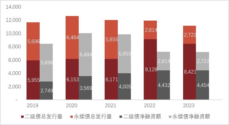 2023年,银行二永债发行量1.11万亿元,同比减少799亿元,或受经济温和修复态势下信贷投放放缓影响;净融资量7176亿元,同比减少71亿元。