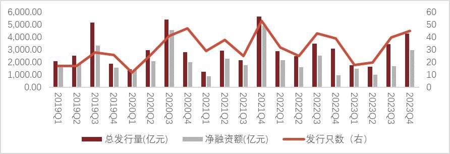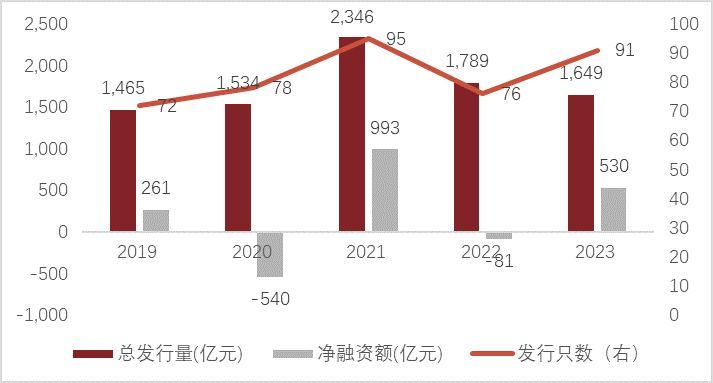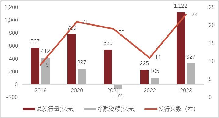 2023年,证券公司次级债总发行量1649亿元,同比有所下降,但因偿还压力较去年有所缓解,净融资量回升至530亿元。