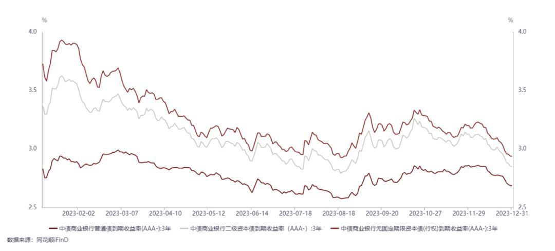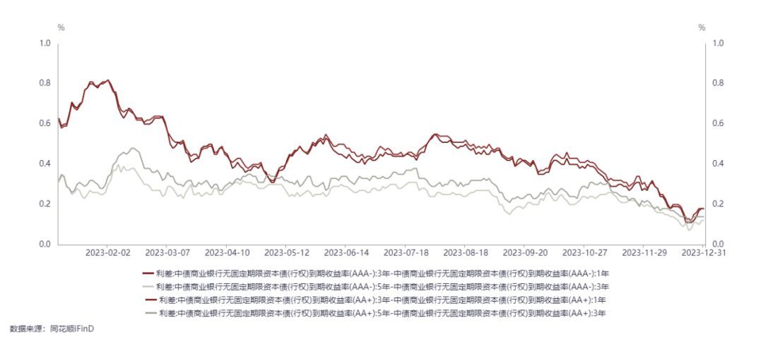 从趋势上看,在2023年春节前债市经历了短暂的估值调整期,商金债和银行二永债信用利差一度走阔。随着春节过后结构性“资产荒”演绎,在配置盘带动下,商金债和银行二永债信用利差大幅压缩。年末保险、银行抢跑配置行情,各类型金融债下行至相对较低(40%以下)历史分位水平。