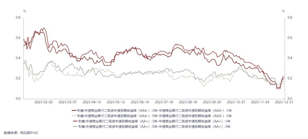 从期限利差表现来看,与年初相比,各品种期限利差均有明显下行。尤其8-12月,由于资金面趋紧,3Y/1Y期限利差压缩更为明显,至12月初1、3、5Y相邻期限之间的利差均压缩至10-20bp附近。直至最后一周1Y商业银行普通金融债表现亮眼、大幅下行,与3Y利差再度拉开。