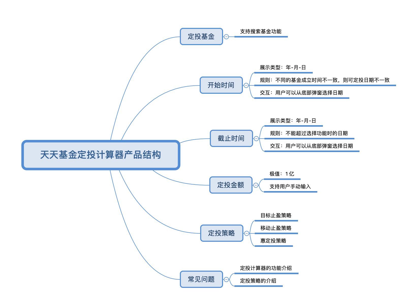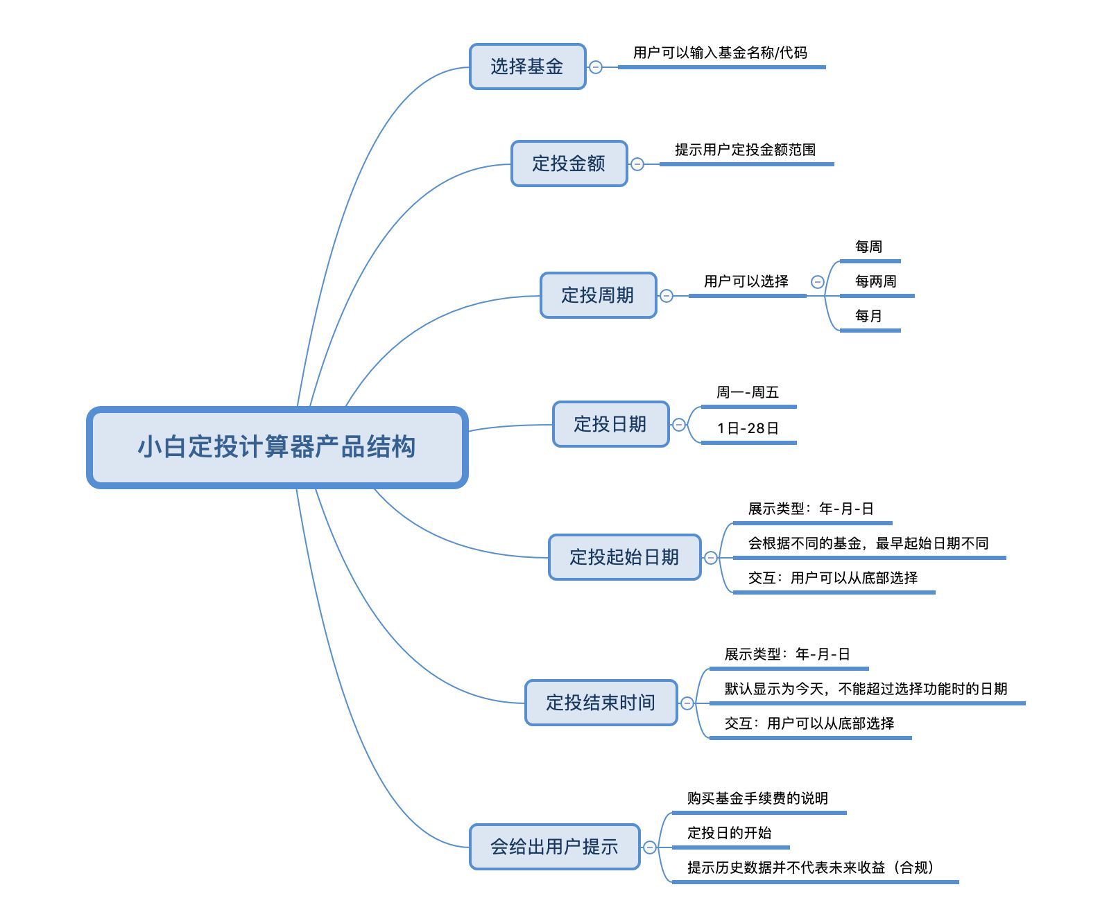 对于功能的设置,我们尽量要先以满足业务优先,所以我们在设计定投计算器时,需要先把收集关键数据为首位,我们需要收集「基金信息」、「定投金额」、「定投周期」、「定投起始时间」、「定投结束时间」;