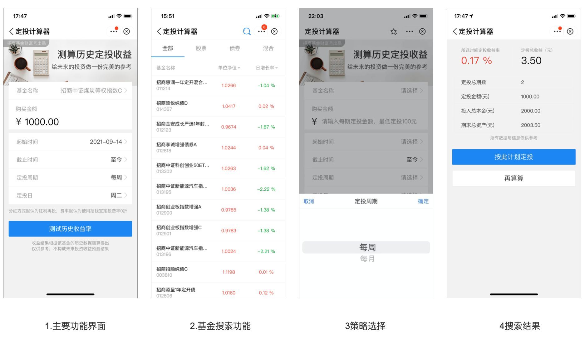 不支持用户设定定投周期、及定投日,与实际的定投功能有区别,无法让用户感受到真实定投环境;各种策略没有详细解释,用户无法理解各定投策略算法的区别,特别是对小白用户和初级投资者,由于看不懂算法策略,更无法设置策略自定义数据;2. 招商基金-定投计算器