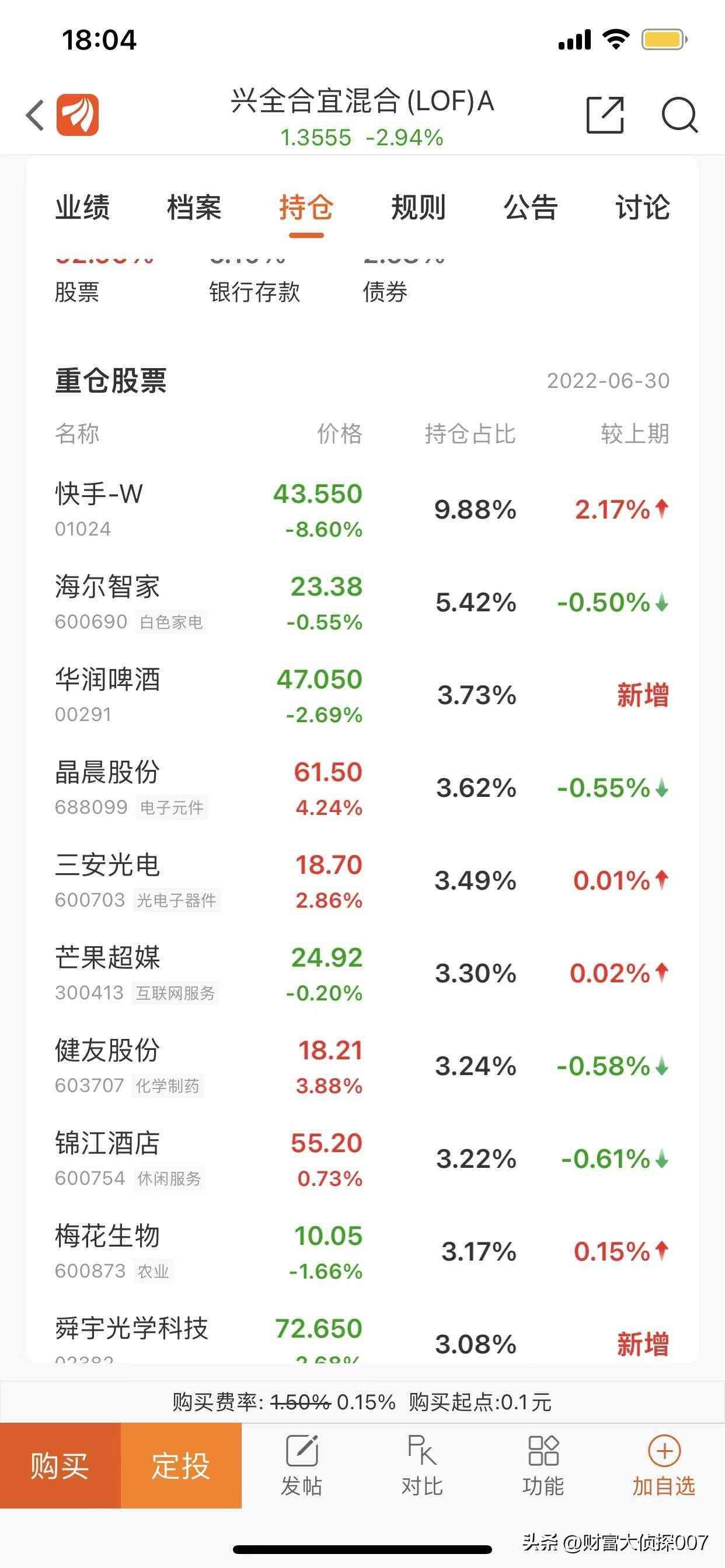 我们来看看今年二季度末持仓情况,主要有快手、海尔智家、华润啤酒、晶晨股份、三安光电、芒果超媒和锦江酒店这些。可以说是非常鲜明的偏消费行业了,目前来看,这两年确实不太行。