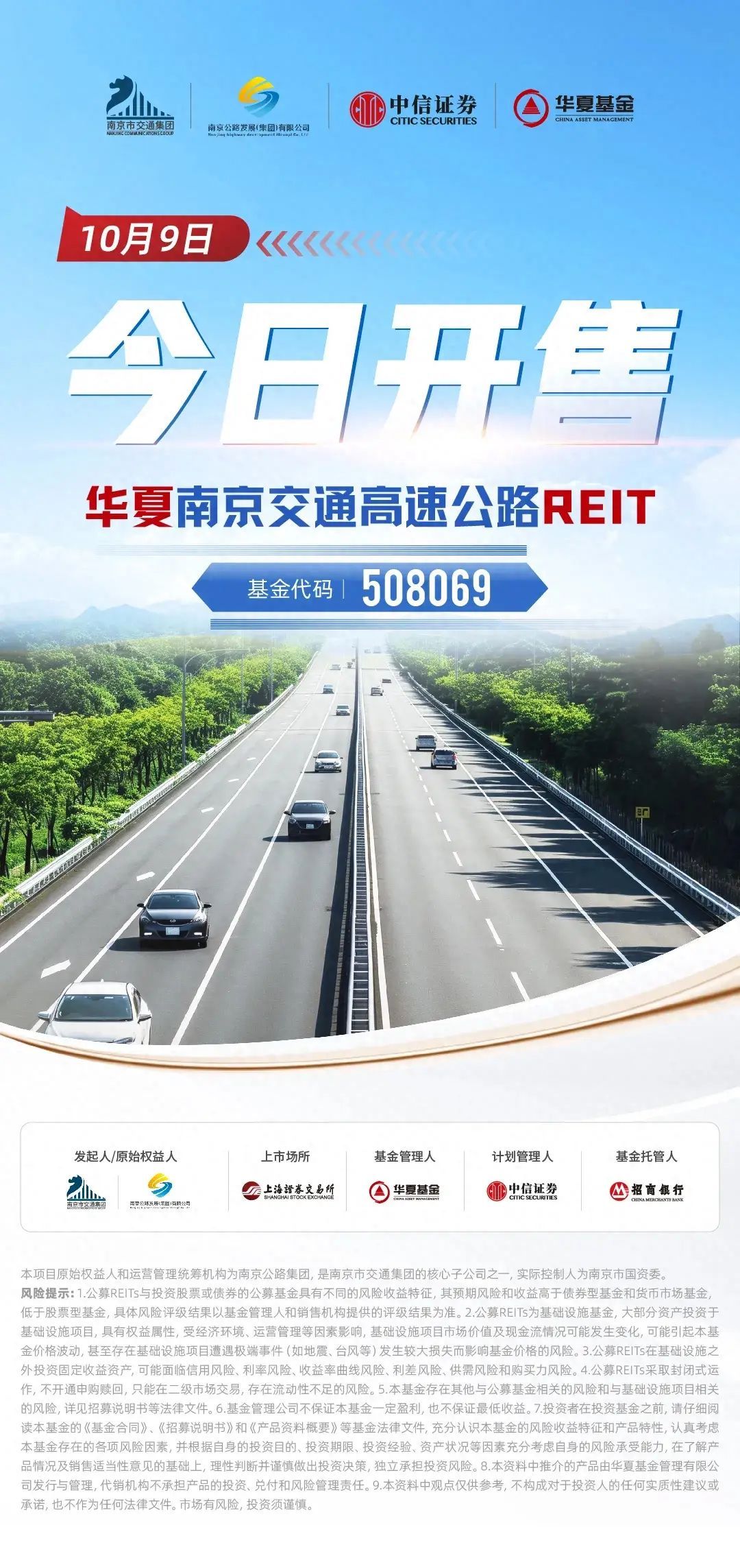 就在今天,华夏南京交通高速公路REIT(场内简称:南京交通,基金代码:508069)公众投资者部分正式开售!