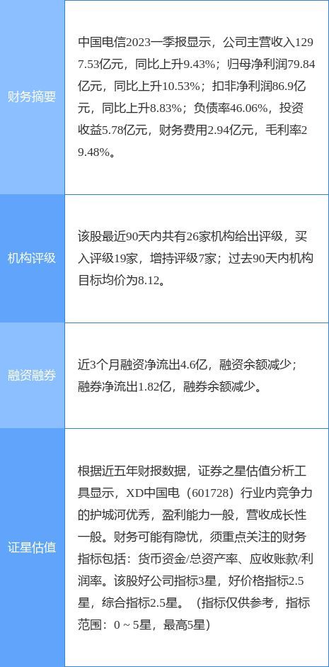 2023年4月21日,浙商证券研究员张建民发布了对中国电信的研报《中国电信2023年一季报点评报告:扣非利润增速领先,折旧及摊销率下降1.0pct》,该研报对中国电信给出“买入”评级。研报中预计2023-25年收入增速10.7%、11.0%、10.9%,归母净利增速11.3%、11.1%、10.5%,维持“买入”评级。证券之星数据中心根据近三年发布的研报数据计算,该研报作者对此股的盈利预测准确度为89.31%。