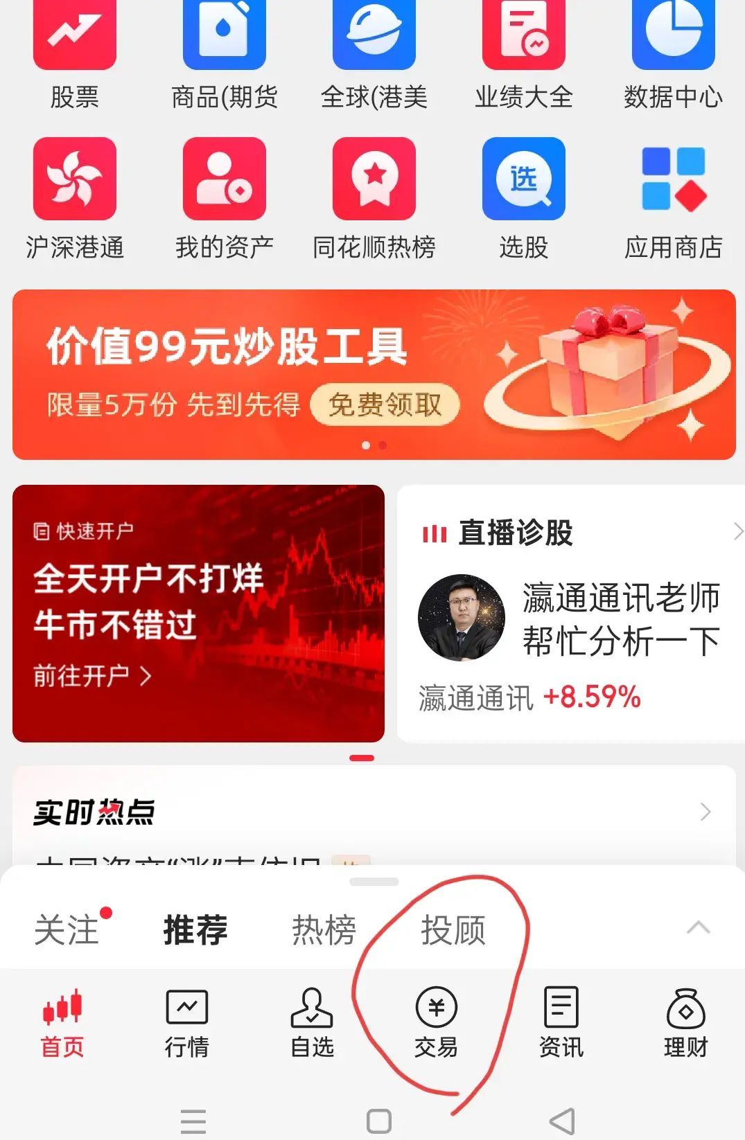 首先,打开同花顺APP。点击“交易”,如图。