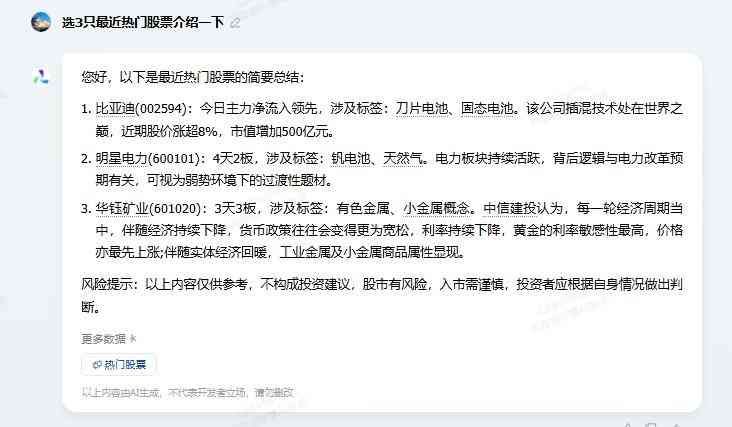 妙想给出的3只热门股票为:比亚迪、明星电力、华钰矿业(日期为2024年5月29日)。再看具体的回答,可以看出妙想对炒股的精调水平是比较高的,能说出“4天2板”这种短线炒股的术语。将3只股票的分析和实际对照,也都是对板的,可以符合笔者对“热门股”的标准。