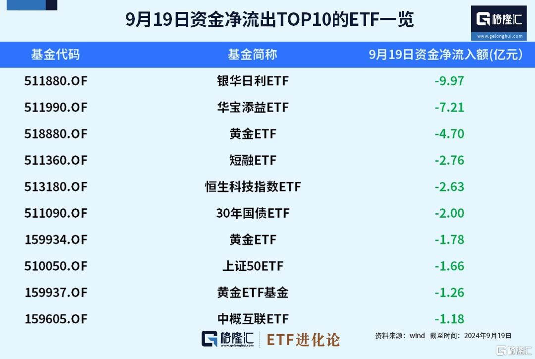 9月19日,ETF资金净流出额TOP10的ETF分别为银华日利ETF、华宝添益ETF、黄金ETF、短融ETF、恒生科技指数ETF、30年国债ETF、黄金ETF、上证50ETF、黄金ETF基金、中概互联ETF,在9月19日分别获得-9.97亿元、-7.21亿元、-4.70亿元、-2.76亿元、-2.63亿元、-2.亿元、-1.78亿元、-1.66亿元、-1.26亿元、-1.18亿元的资金净流入。