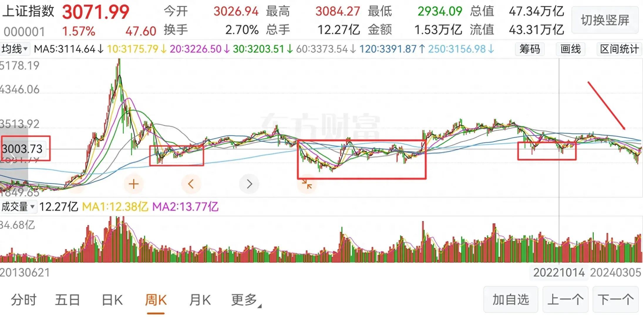 看下图,沪指周K线图,有三个框一个箭头,灰色线33.73点,在灰色横线之下的区域是,现在回头看都是黄金坑。沪指收盘跌破3点持续时间最长的是2018年那年熊市,持续了半年才反弹;后面跌落3点后反弹就比较快了。