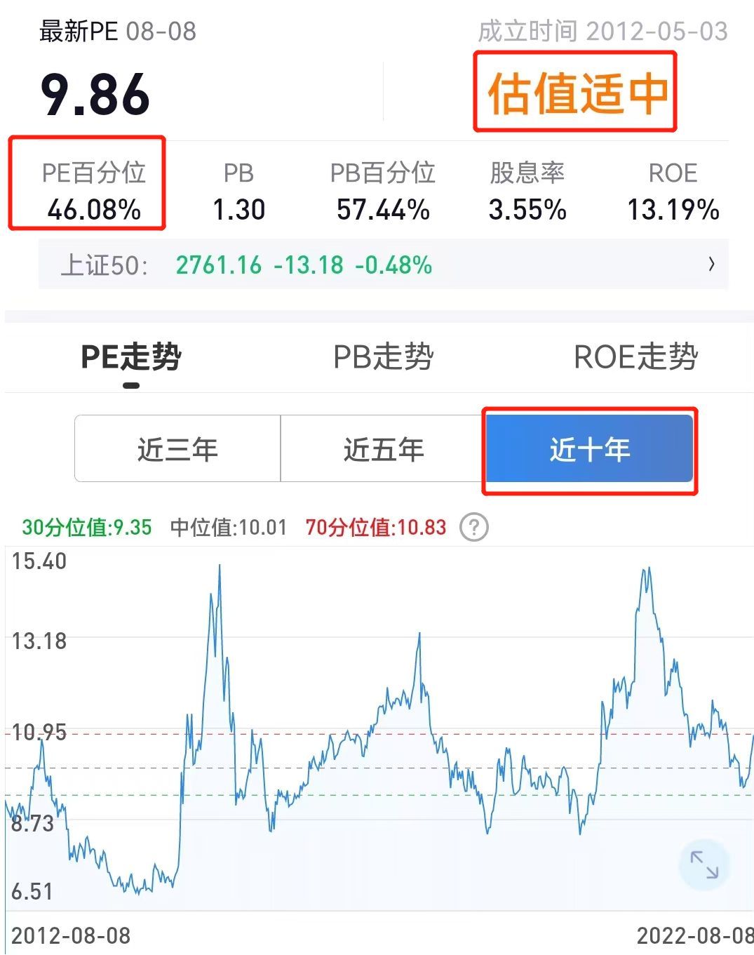在雪球APP或者萝卜投研等很多地方都可以查到一些指数的PE,比如上证50,目前就是处于10年PE值的46.08%的位置,这个也就是在最近的10年中,46.08%的时候都比现在数值低。那么说明目前的位置是处于中位值附近的。所以这里也给出了估值适中的说明。