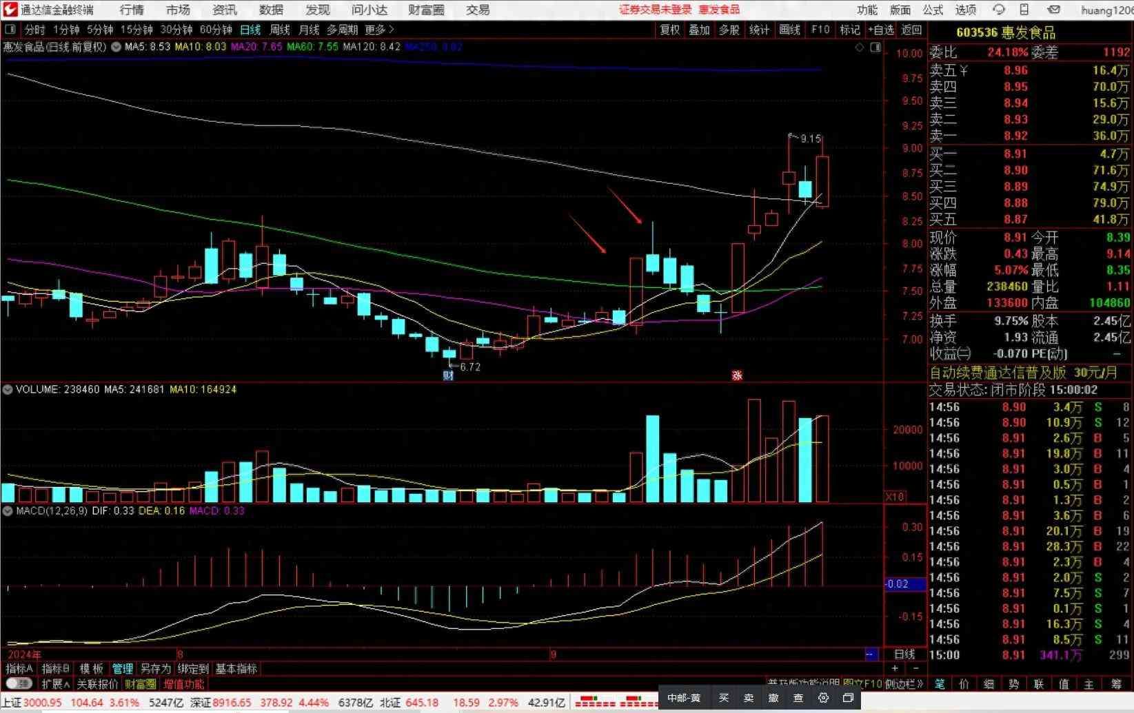 惠发食品惠发食品9月9日首板涨停,次日走出放量的长上影小阴线,随后连续下跌调整4天,成交量不断缩量,9月18日在20日均线处走出缩倍量的十字星,9月19人日放量涨停,这里即是买入点,后面走出连续上涨。