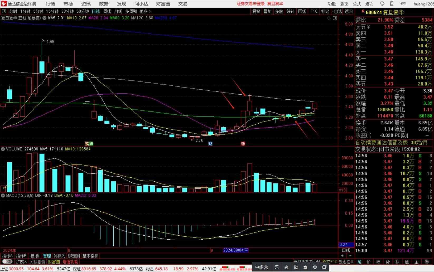 复旦复华复旦复华9月9日首板涨停,次日走出放量中阳线,这里冲高面临120日线的压力,随后回调,9月23日出现缩倍量的十字星,9月24日放量上涨即是买入点,目前上涨趋势中。