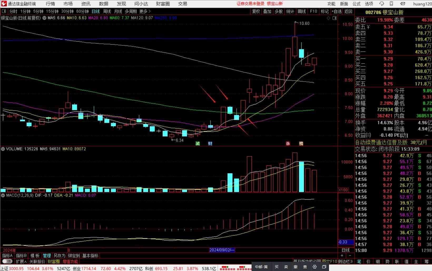 银宝山新银宝山新9月4日涨停,次日平开下跌走出放量阴线,9月6日缩量小阴线,9月9日放量涨停即是买入点,后面走出连续上涨。