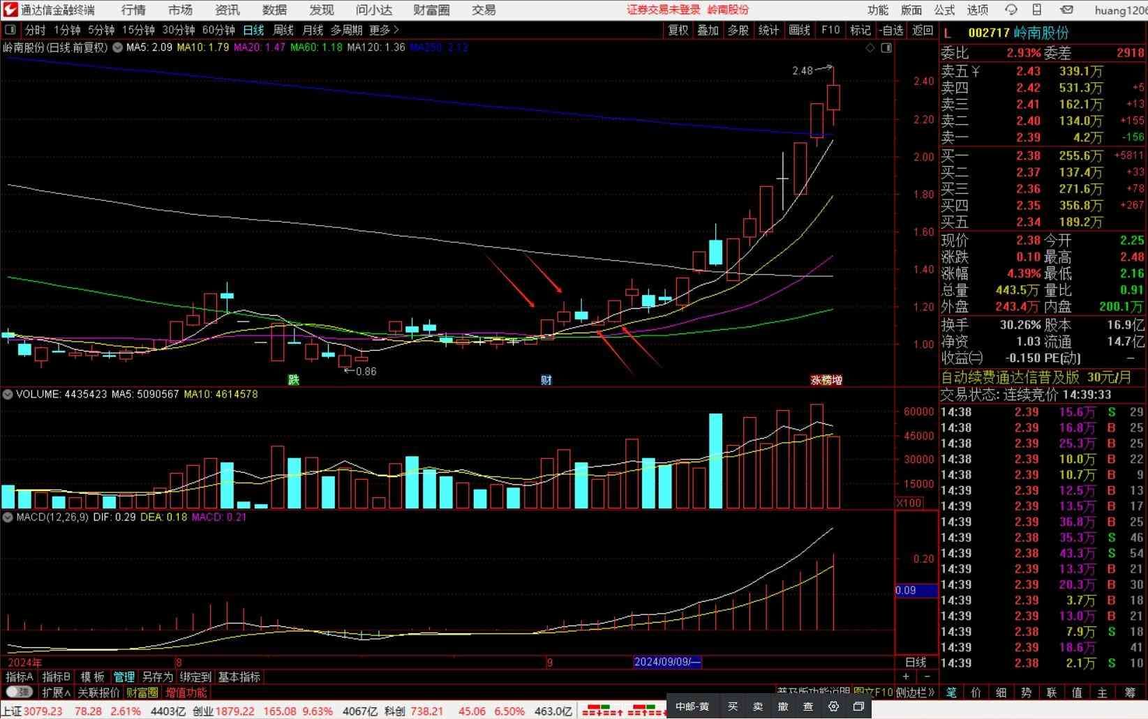 岭南股份岭南股份9月2日首板涨停,次日走出放量的小阳线,9月5日缩倍量假阳真阴,9月6日小幅放量涨停,随后横盘4日后迎来一波连续上涨。