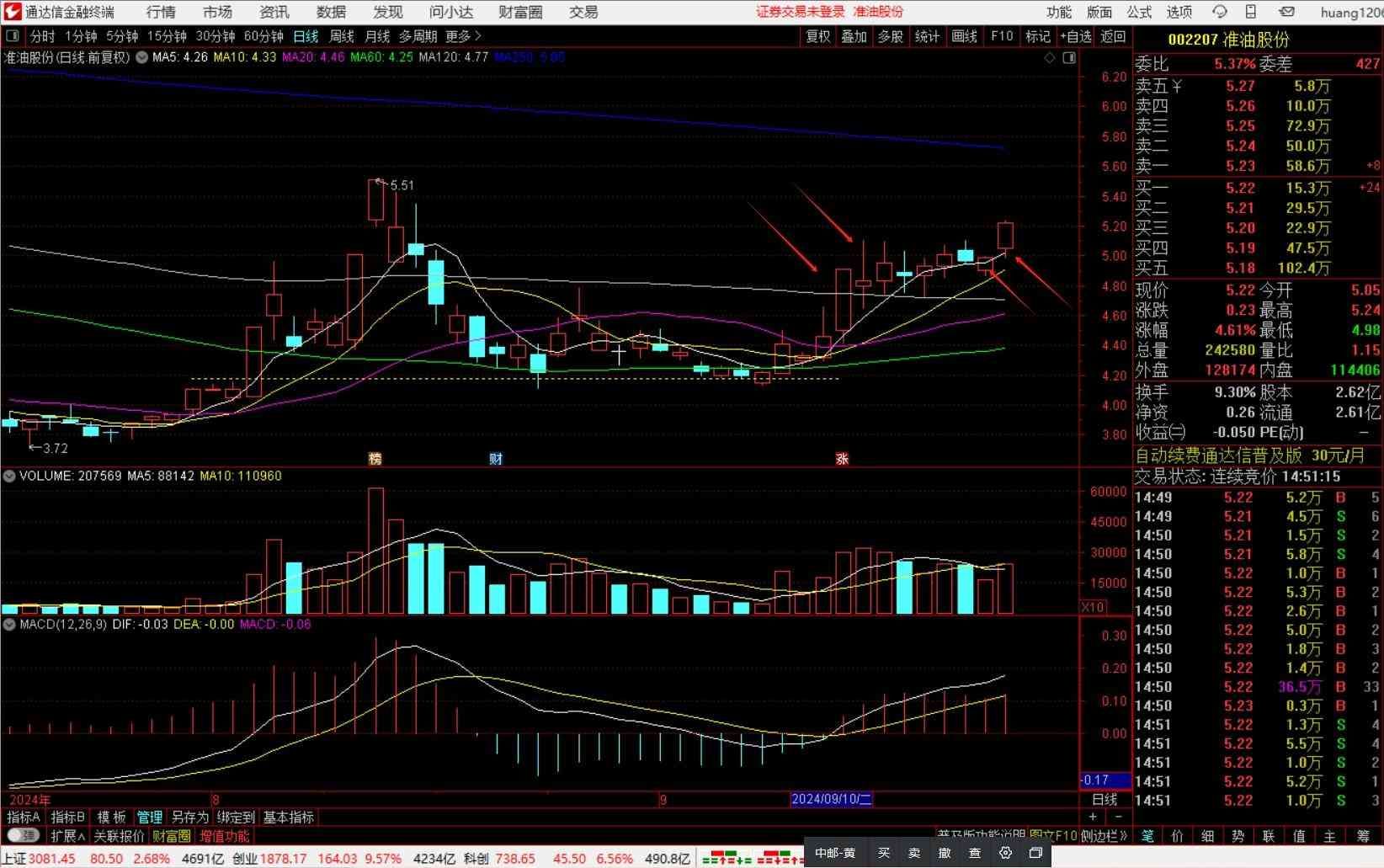 准油股份准油股份9月13日首板涨停,次日放量长上下影线的小K线,随后横盘,9月26日缩量小阳线,9月27日跳空高开上涨即是买入点,等待上涨。