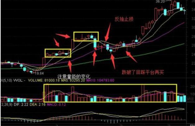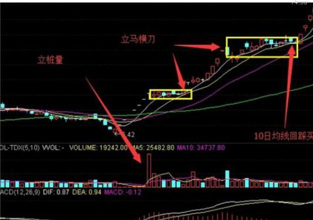 股价在上涨行情中,某一天成交量突然放出巨量,股价开始拉升,到一定高点时,开始横盘整理,回踩10日均线,阴线买入,第二天或第三天,通常会再次以大阳线突破