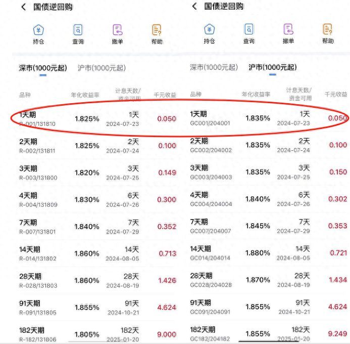 根据2024年7月22日股市收盘时国债逆回购的利率可以算出,深市国债逆回购10万一天收益5元,沪市国债逆回购10万一天收益大约为5.027元。
