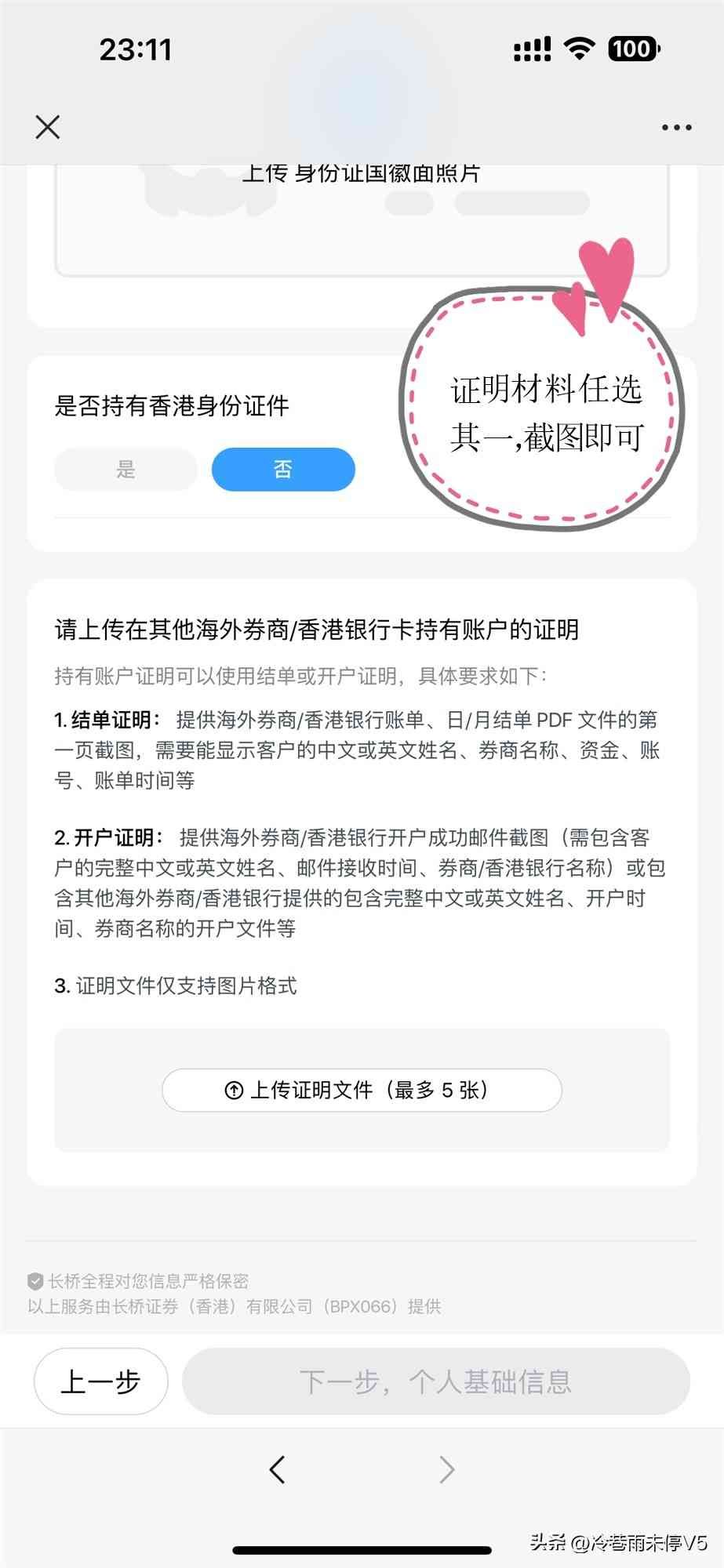 大陆身份证香港的银行卡(后面入金需要)境内银行卡号和银行预留的手机号(实名认证用)海外券商月结单(人在香港时无须月结单,如无,可以用香港地区银行的月结单代替)Tips:中银香港的月结单可以登陆中银(香港)的APP,点在线客服,输入下载电子接单,看到客服自动回复的链接点进去,截屏即可。
