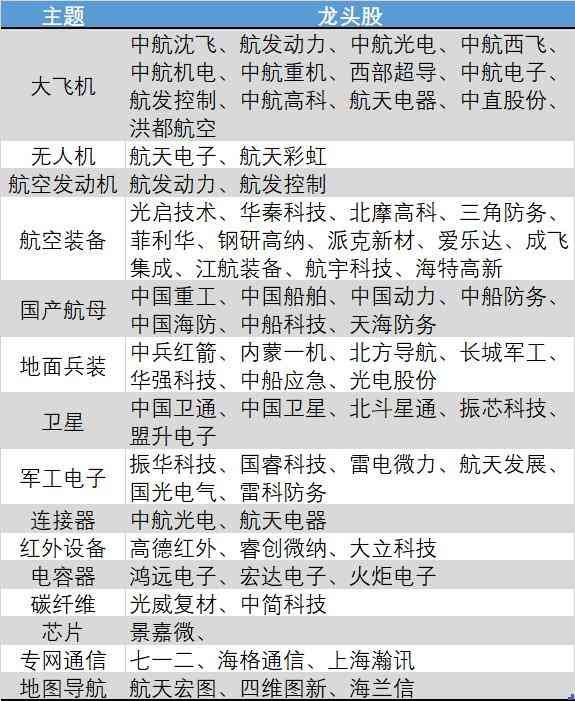 目前,A股全部上市公司中,国防军工行业共有122支股票。其中各个细分行业龙头如下: