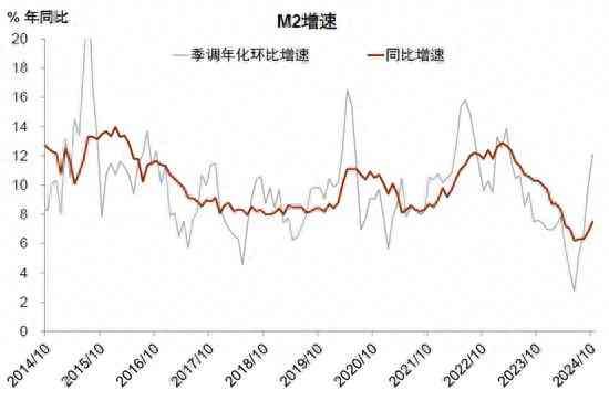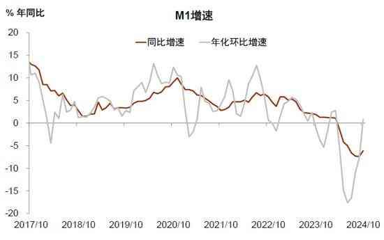 10月金融数据最引人注目的是货币增速回升,M1与M2增速均出现了明显的反弹。10月M2同比增速从上个月的6.8%回升到了7.5%,是今年4月以来的新高,年化环比增速达到12.1%、是2023年1季度以来的新高(图表1)。与此同时,M1增速也出现了回升:M1同比增速从9月的-7.4%上升至10月的-6.1%,年化环比增速0.9%、7个月以来首次转正(图表2)。