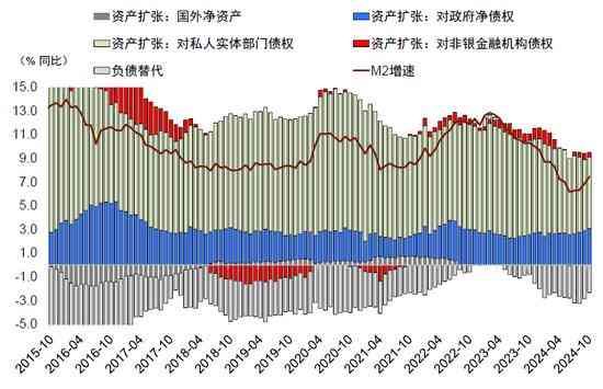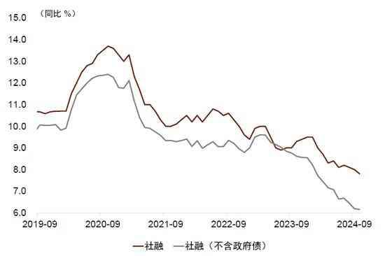 存款增速的下跌也应该引起重视,与之对应的是融资增速仍待提高。要让短期的货币供应改善可持续,财政扩张仍然是最重要的因素。9月底以来一系列的政策起到了预期引导的效果,无论是股市还是楼市,成交量都出现了明显的增长,社会风险偏好出现明显改善,也带动了货币供应的回升。但需要注意的是,社融增速仍在下滑,非政府部门的社融增速处于低位、尚未出现扭转迹象,信贷增速也在继续下滑。10月新增社融1.40万亿元,存量同比增速下滑至7.8%,非政府部门的融资同比增速6.2%(图表8)、与上个月基本持平,人民币贷款同比增速小幅下降。根据我们的测算,对私人实体部门的债权扩张增速仍然在下降,拖累M2增长(图表5)。如果缺乏资产端的持续扩张,仅依靠存款结构的调整很难真正改善社会的流动性供应。11月8日的新闻发布会[3]指出2025年将实施更加给力的财政政策,包括积极利用可提升的赤字空间、扩大专项债发行规模、继续发行特别国债等。如果财政政策能够实现较大幅度的融资增长,那么货币供应的改善将更有持续性,经济增长和通货膨胀的改善也会更有持续性。