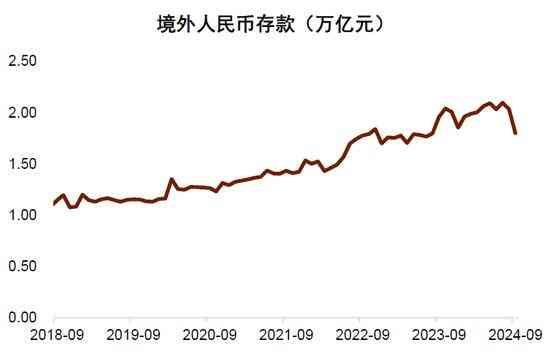 ► 另外一个原因有可能是风险资产配置驱动的存款结构调整。10月存款一个很明显的特点是,居民与企业存款流向非银机构。10月非银金融机构的存款净增加1.08万亿元,但是居民存款减少57亿元、企业存款减少73亿元[2]。我们推测有可能私人部门(也包括金融机构)降低了对一些高收益且不计入M2的存款(比如可转让存款)的配置,或者降低了海外人民币存款的配置。在这个过程当中,私人部门(甚至可能包括金融机构)选择赎回或者到期不再续作自己的高收益存款,或者将境外的人民币存款转回国内,将这部分资金用于购买股票或者是购买房地产。9月我们观察到人民币境外存款的存量在下降(图表9),这一现象在10月有可能继续。在此过程中,原来不计入M2的存款就变成了其他类型的存款计入M2。根据我们的测算,这部分对M2的影响可能达到0.5个百分点左右(图表5)。类似的现象在今年2月也出现过:2月扣除财政存款之后的总存款增速较1月下降了0.5个百分点,但是M2增速却维持在8.7%不变,当时也出现了股市的明显上涨。