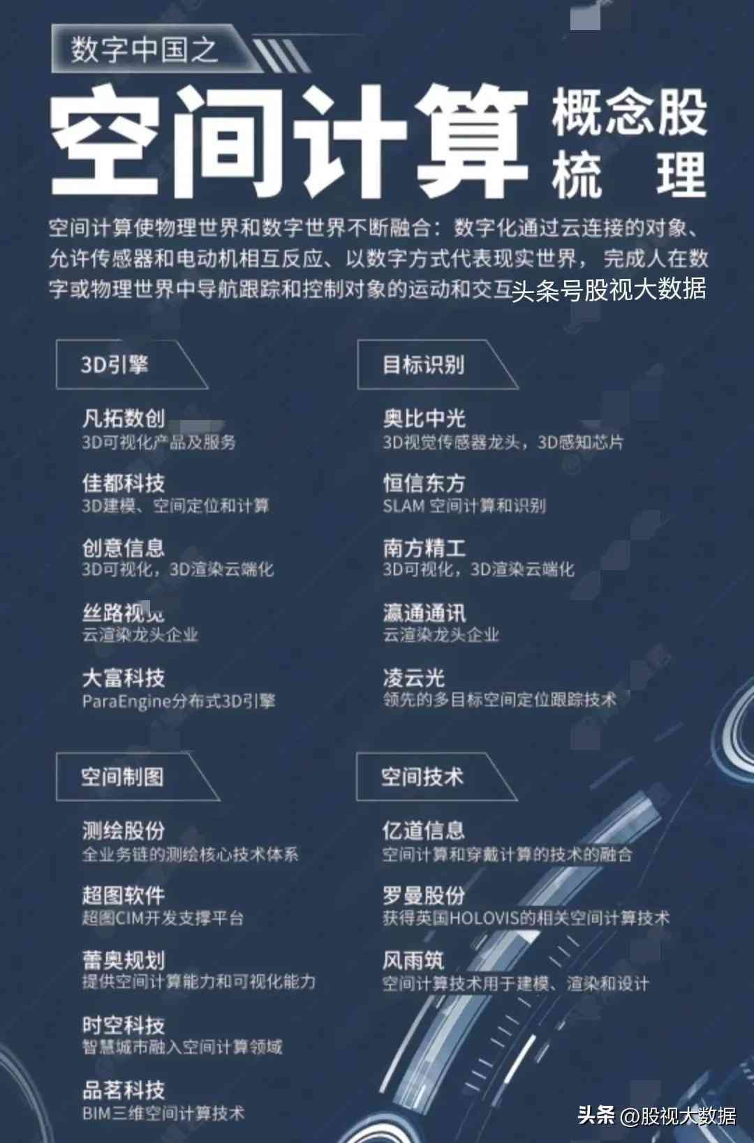 空间计算是一系列让人能在三维空间中与计算机交互的技术。代表龙头企业:南方精工、佳都科技、创意信息、恒信东方