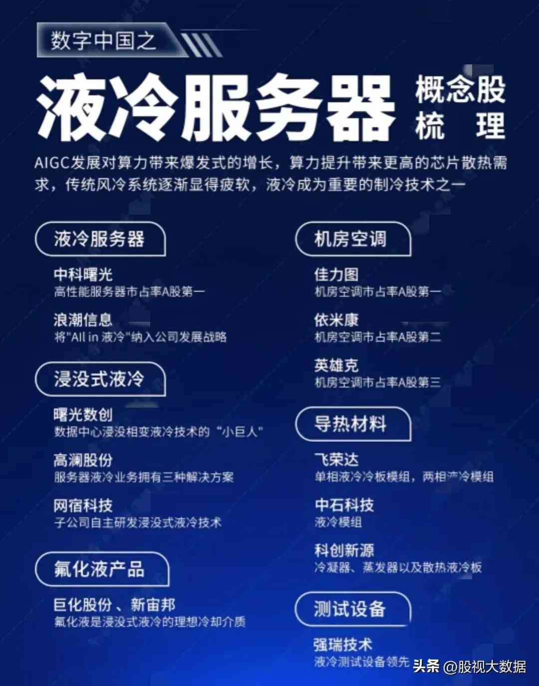 数字中国是一个庞大的概念,涉及板块众多,这是该系列第一集,本次分享概念:AI算力芯片、数据交易、数据要素、空间计算、数字货币、液冷服务器等等概念龙头。