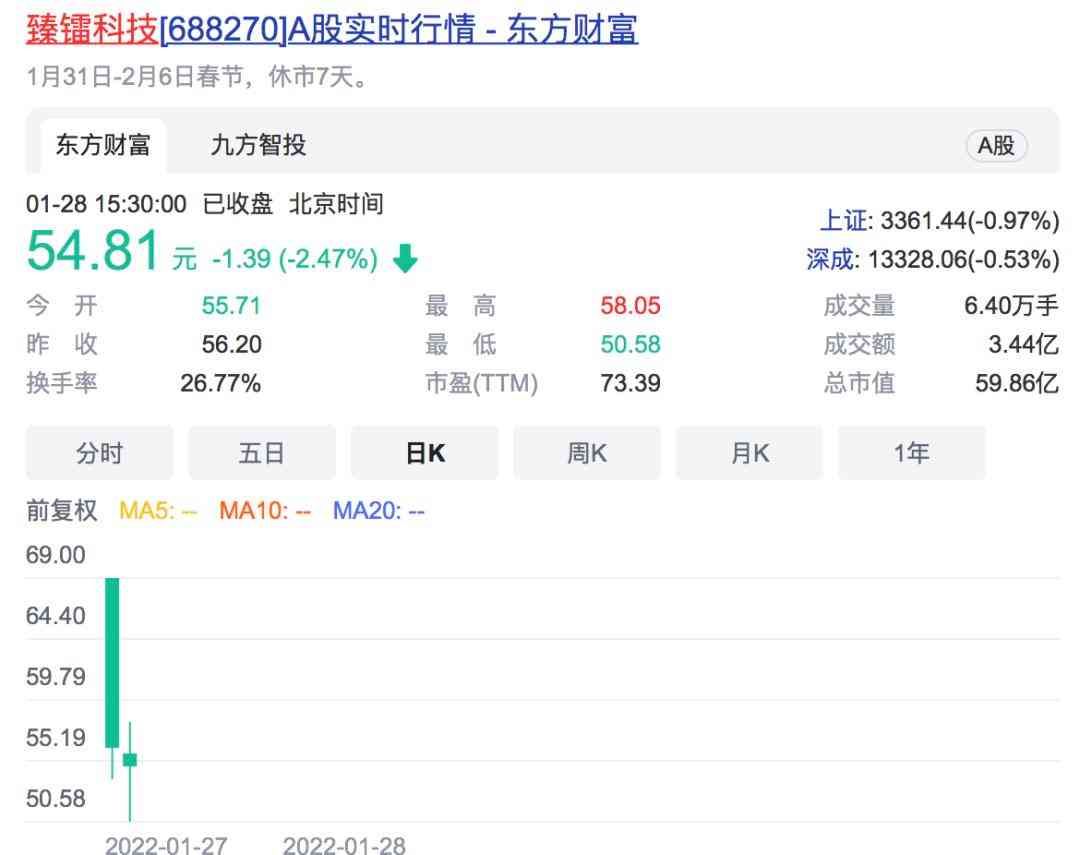 牛年最后一周(1月24日到28日),A股市场震荡下行,新股破发仍然持续。剔除吸收合并上市的龙源电力外,该周上市的11只新股中有1只破发,为科创板的臻镭科技。1月27日臻镭科技登陆科创板,上市首日开盘大涨11%,就在投资者高兴时,股价转头就大俯冲,1分钟后,臻镭科技破发。截至当日收盘,臻镭科技跌9.18%收报56.2元,中一签亏损2840元。