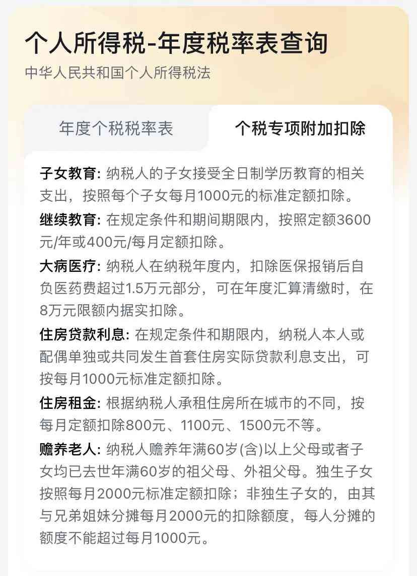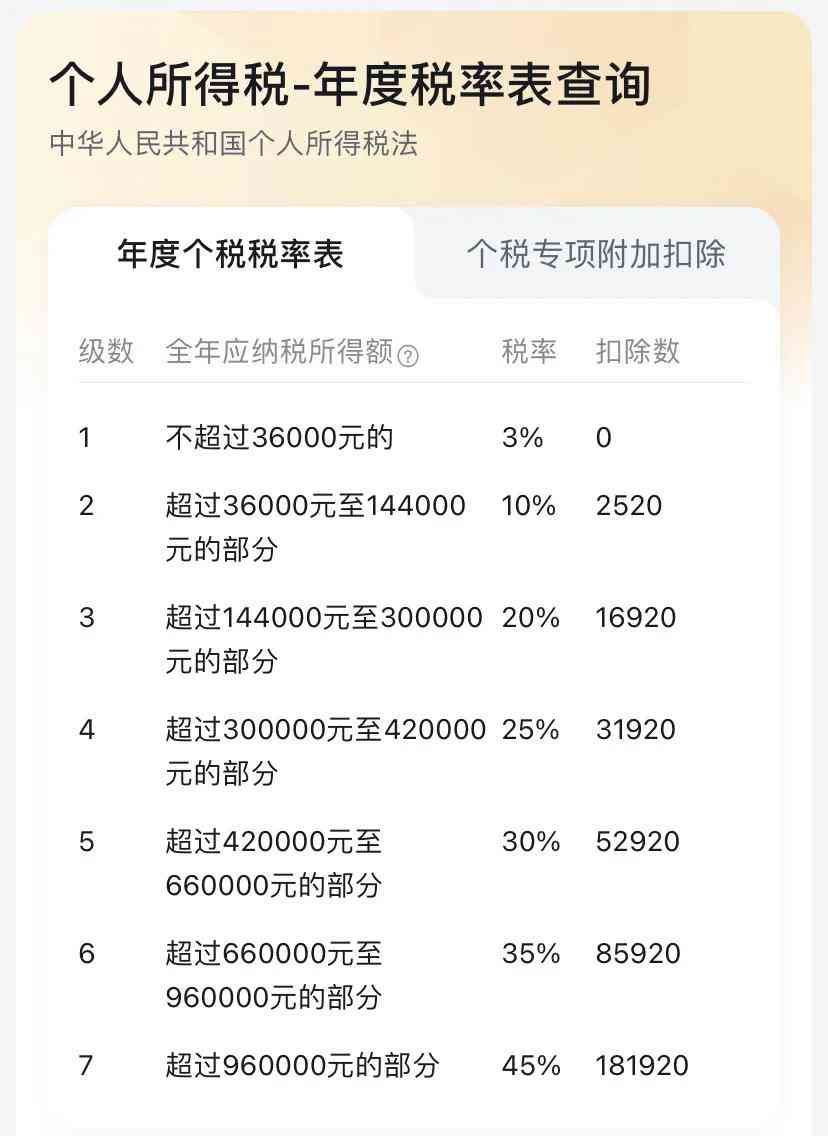 其次个人所得税具体的计算办法,超简单的,你的税前年收入减去五险一金后再减去6和专项扣除,得到的结果叫全年应纳税所得额~这个数字去乘表里对应的税率~得出的结果再减去对应的扣除数~减完后的数字就是需要交的年度个人所得税,就这么简单~
