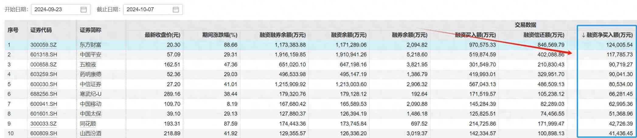 个股方面,记者据Wind数据统计发现,9月23日至今,沪深两市融资额买入最高的10只股依次分别是东方财富(359.SZ)、贵州茅台(6519.SH)、中信证券(630.SH)、中国平安(601318.SH)、药明康德(603259.SH)、赛力斯(601127.SH)、农业银行(601288.SH)、五粮液(0858.SZ)、华泰证券(601688.SH)和万科A(02.SZ)。期间,东方财富的融资净买入第一,达12.4亿元,区间累计上涨88.66%,股价报20.30元,创下2022年8月以来新高。中国平安的融资买入额也超过11亿元。