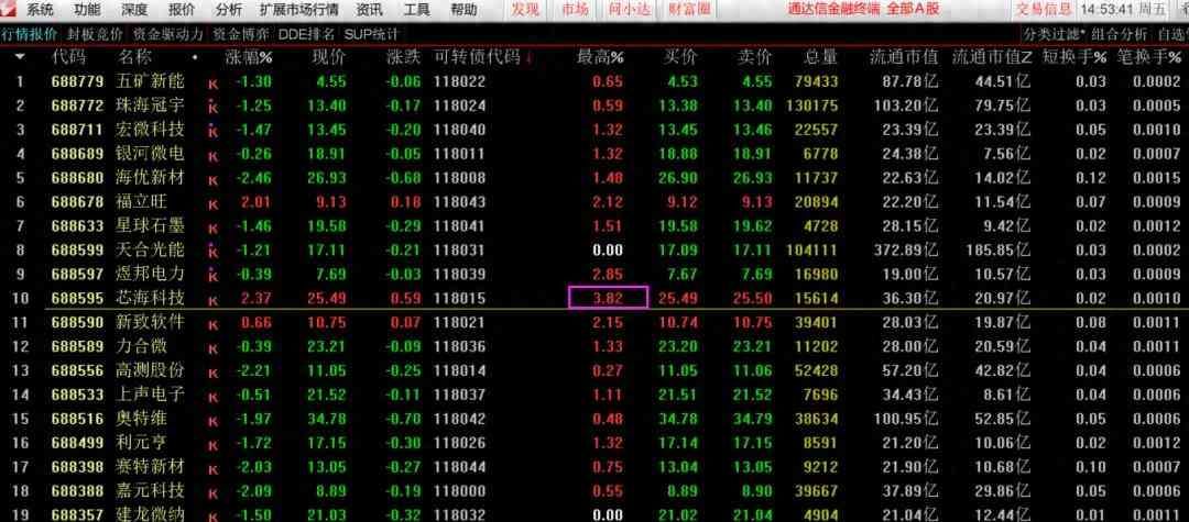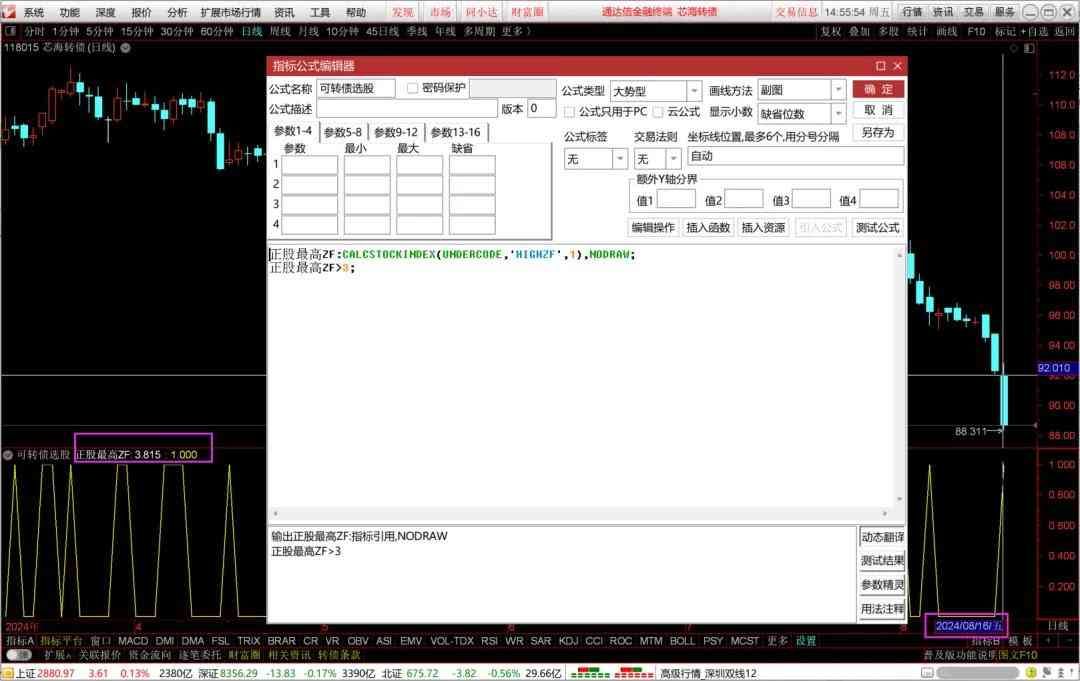 正股最高ZF:=CALCSTOCKINDEX(UNDERCODE,'HIGHZF',1);正股最高ZF>3;▲向左滑动查看完整公式源代码