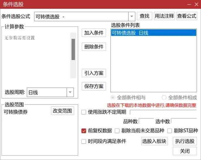 选股公式在实现过程中,先以幅图展示,验证数据正确后,再转换成条件选股,条件选股名称“可转债选股”。