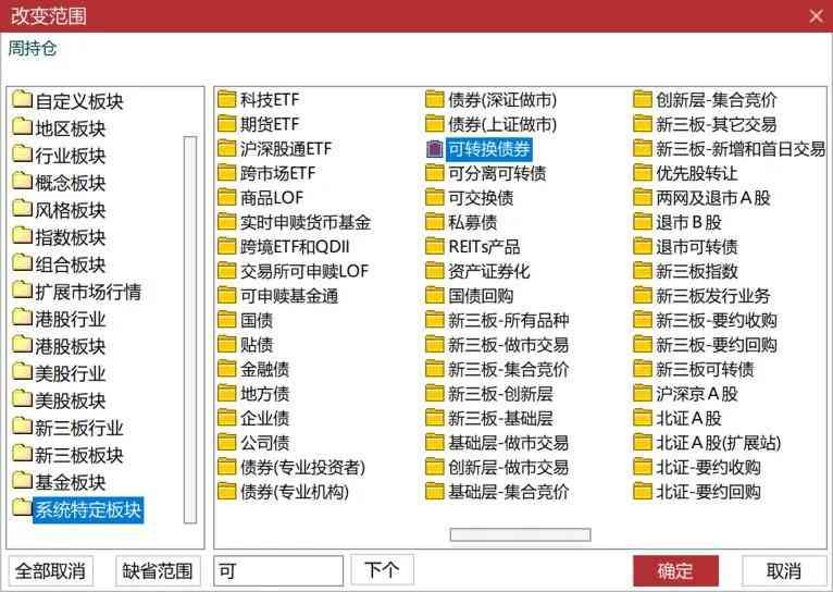 改变选股范围选择左侧最下面的系统特定板块里的可转换债券。
