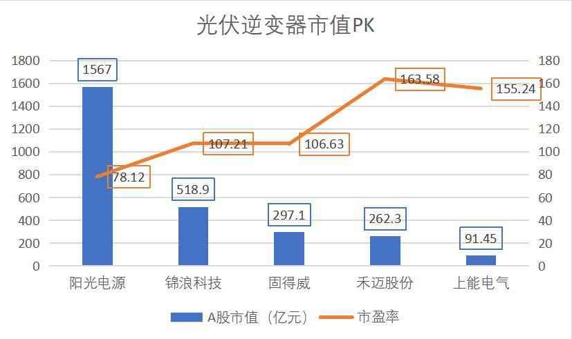 逆变器公司在市值上可谓是天地之别。当前阳光电源市值超千亿元,而上能电气的市值不到百亿元。4月1日上市不久的禾迈股份市值也仅刚超260亿元,市盈率已逾160倍。