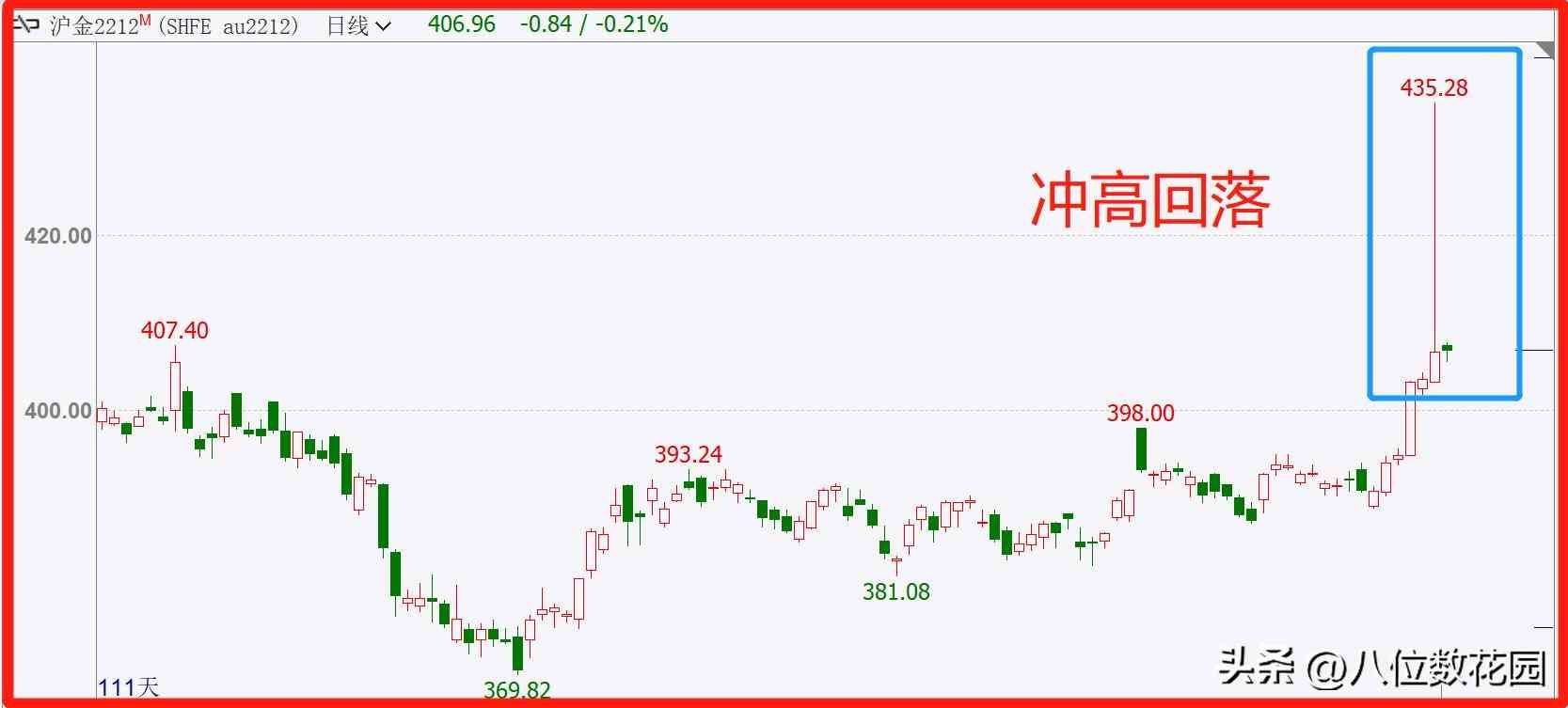 图中是上海黄金2212合约的日线k线图,受美国CPI数据影响,黄金开盘大涨,快速地冲高,随后回落收出长上引线的阳线。