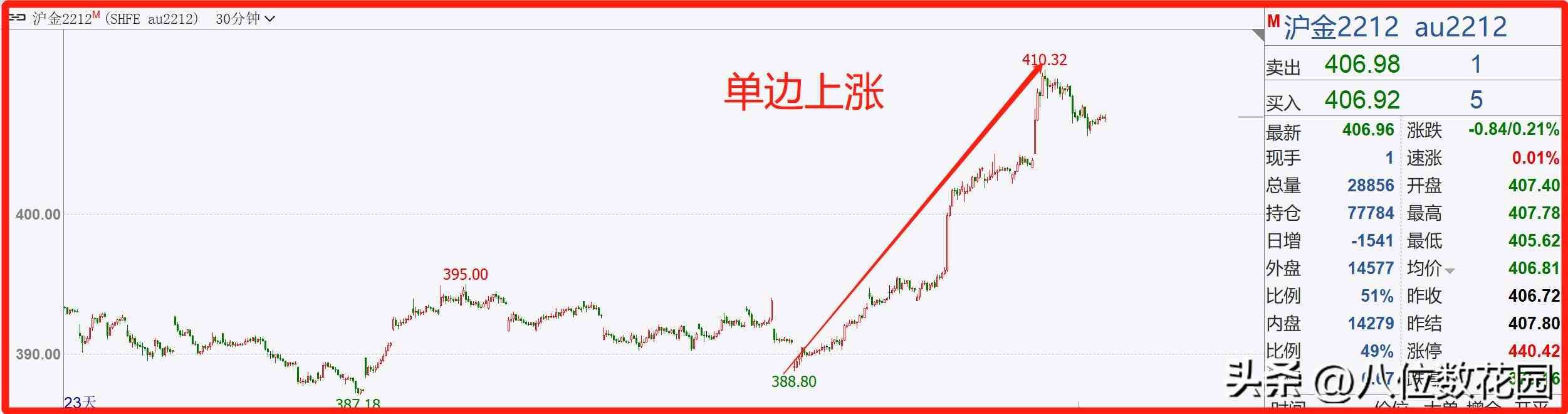 图中是上海黄金期货一波单边上涨的走势,行情启动多头之后,持续地上涨,上涨过程只有非常小的整理形态,在高位快速冲高后,行情开始企稳回落。