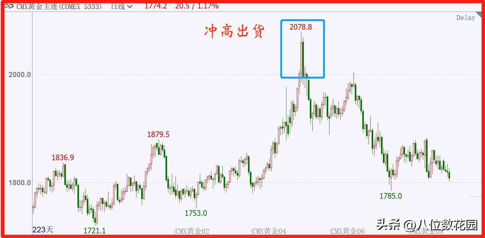图中是现货黄金日线图,今年3月份受俄乌冲突刺激,黄金展开多头趋势,在趋势的尾端出现了波幅空间大,波动速度快的吞没k线形态,这是标准的冲高出货的走势,随后黄金进入震荡下跌。