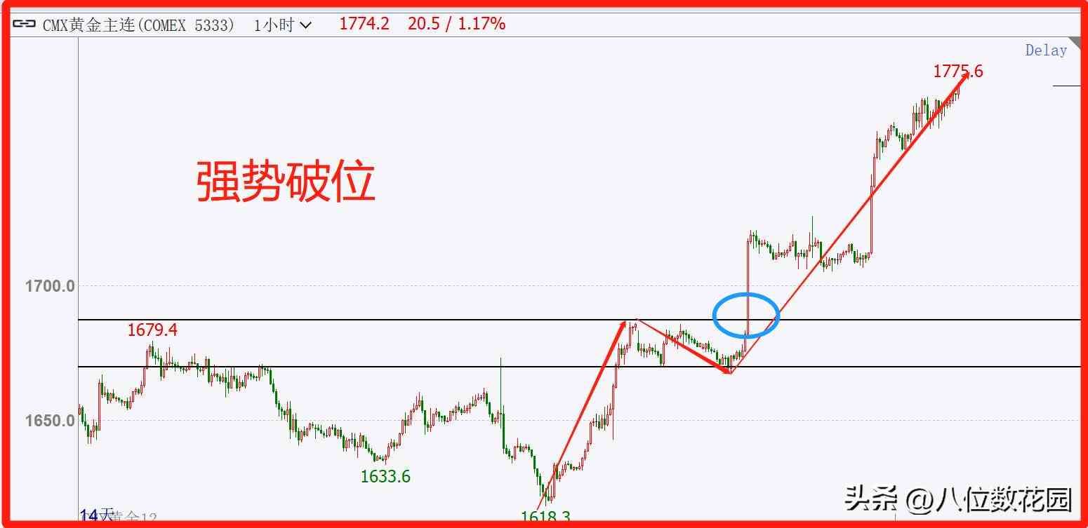 图中是现货黄金1小时级别的k线图。黄金触底反弹之后,快速地上涨,测试到1679附近的压力,在压力附近形成窄幅的整理,随后行情强势破位, 破位k线的波幅大,速度快,破位之后,行情延续多头。