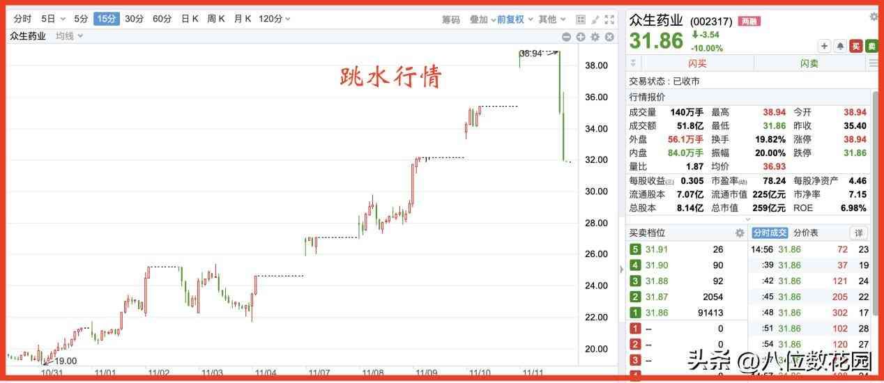 图中是众生医药上周五的一波下跌,上午行情跳空,高开涨停,下午突然之间向下跳水,快速下跌,并触及跌停。