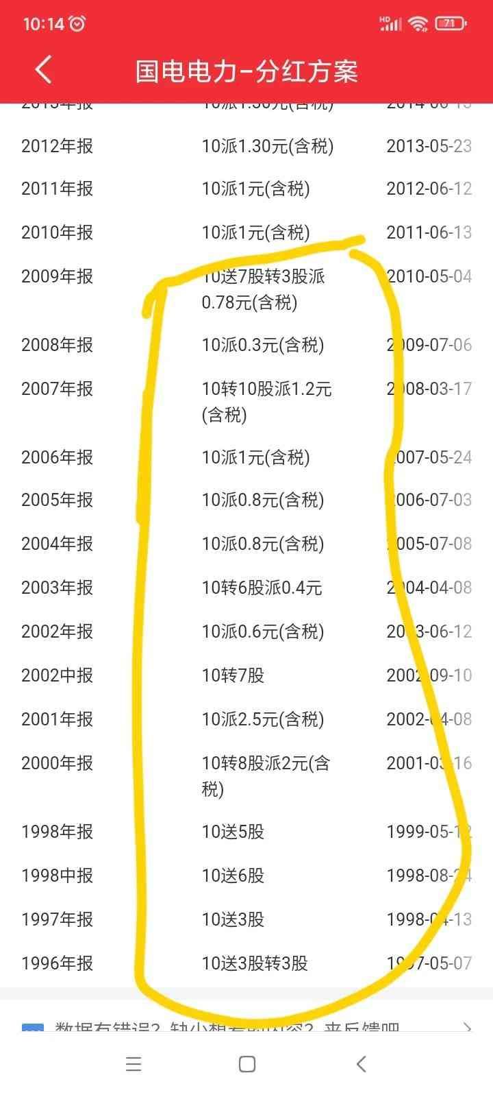 国电电力上市28年股价涨了1多倍,我昨天发了这个头条。收到了好多股友私信。问是怎么算的。其实,我也不是很明白。我只是分享一下股市信息。首先。这条新闻来源于昨天的同花顺里的一则新闻。请广大股友看我昨天发的头条里的截图。至于股价涨了1多倍。说实话,我数学也没多好。也不知道咋算的。我今天也算了一遍。按现在的股价涨幅,应该可以8多倍才对。国电电力是火力发电,国企上市。上市日期是1997年3月18日,发行价是1.4元。上市以来涨幅,同花顺今天显示是59118.36%。我假设上市打新中的新股,价格就是1.4元,持有这28年。算法按,1.4x(59118.36÷1)=827.65704元。股价涨了8多。用827除以1.4元。涨了590倍。这是我算出来的。但如果,复权国电电力,后复权,年线看最高到了1387块多。如果用复权价格计算。股价确实涨了接近1倍。至于同花顺那篇新闻里算出来的股价涨1多倍。我也没算出来。数学不行没办法。但不管怎么说。我个人都不得不承认。这是只牛股。至少曾经是。至于很多人说它没赚到钱。其实,我和大家一样,在它身上也没赚多少,我1.9元多一股买的,也没赚多少。因为涨点就卖了。而它现在的股价,我觉得又比较贵。至于这只股票为什么会涨这么多。很多人说是增发,增发只能说股票数量多了。但不影响,股票价格复权。这只股票。其实涨幅最大的是2010年前。大家不信,可以看国电电力历史所有分红。我2011年买的,几千股,即使留到最最高点卖,也就翻了几倍而已。但2010年以前,才是国电电力的高光时刻。1996年年报,它是10送3股转3股。假设买了1股,一下就变成160股。97年年报10送3股,98年中报10送6股,98年年报10送5股,20年年报,10转8股派2元,21年10派2.5元。02年中报10转7股,02年年报10派0.6元,03年年报10转6股派0.4元。07年10转10股派1.2元。09年10送7股转3股派0.78元。也就是说国电电力。从1996到29年这段年份里,通过年报分红转股送股,股本快速扩张。假设。我们从中签1.4元,留到此时。就应该能赚到这只牛股的最好的时间段了。而从2010年至今年年报23年,全部都是现金分红了。可以说,2010年买入至今算的话,就错过了它的高成长,如果在这个年份的最高点买的股友,应该是最难过的。大家都可以想一下,当初中签1.4元一股,经过这么多年的送股转股,自己手里的股份得增加多少?所以。我们其实不用太纠结国电电力到底是涨了1倍还是多少倍。而是可以让这只股票当个借鉴。在股市里寻找下一个可以在早期便宜。股本少。给我们能带来收益的好股票。如果大家有觉得好的股票。非常渴望大家能分享给我。上图,供大家参考