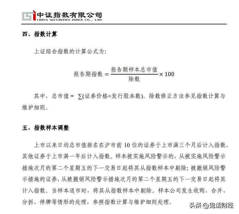 如果没有那么多新股上市,我们的A股市场最常用的上证指数到底应该是多少,究竟和当年相比涨了多少,怎么计算才最准确呢?首先我们就需要了解一下上证指数是怎么来的。在中证指数公司官方网站上可以找到上证指数的编制规则,指数以1990年12月19日为基日,以1点为基点。上证综合指数的计算公式为:报告期指数 = (报告期样本总市值/除数)×1其中,总市值= ∑(证券价格×发行股本数)。这个公式中的除数就是经过调整后的基期市值。