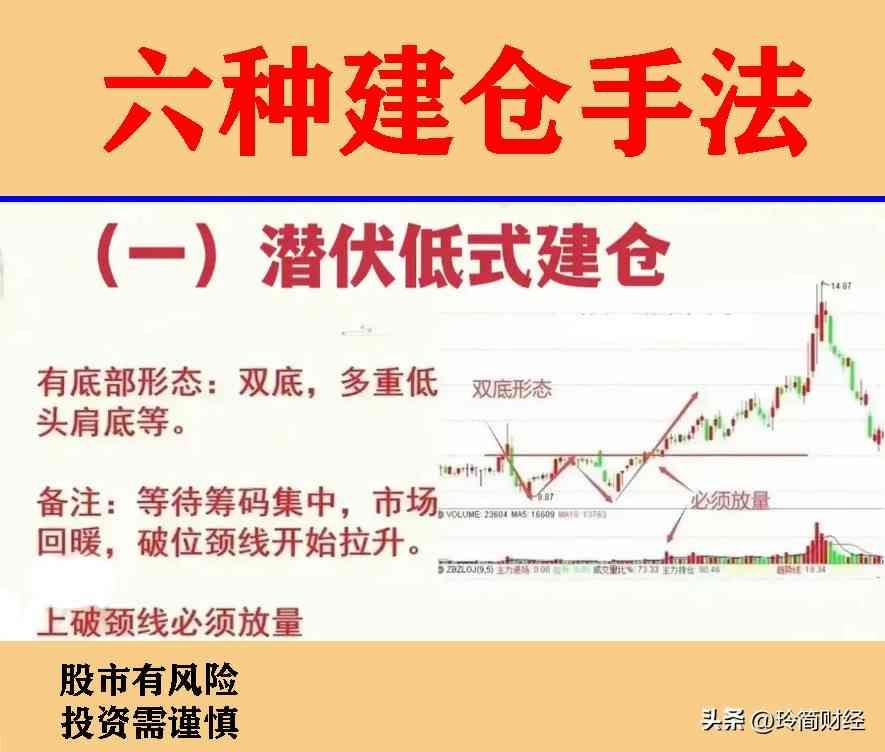 第一,潜伏低式建仓。在股票价格处于一个比较低位的时候,选择一些高质量的股票进行建仓,然后等待行情好转,股票价格上涨时逐步加仓。