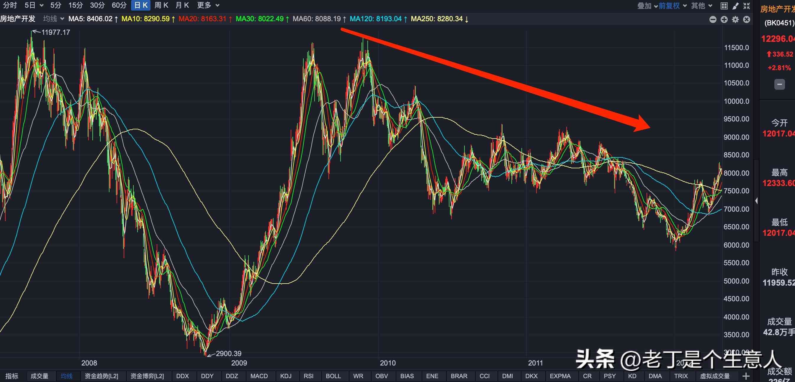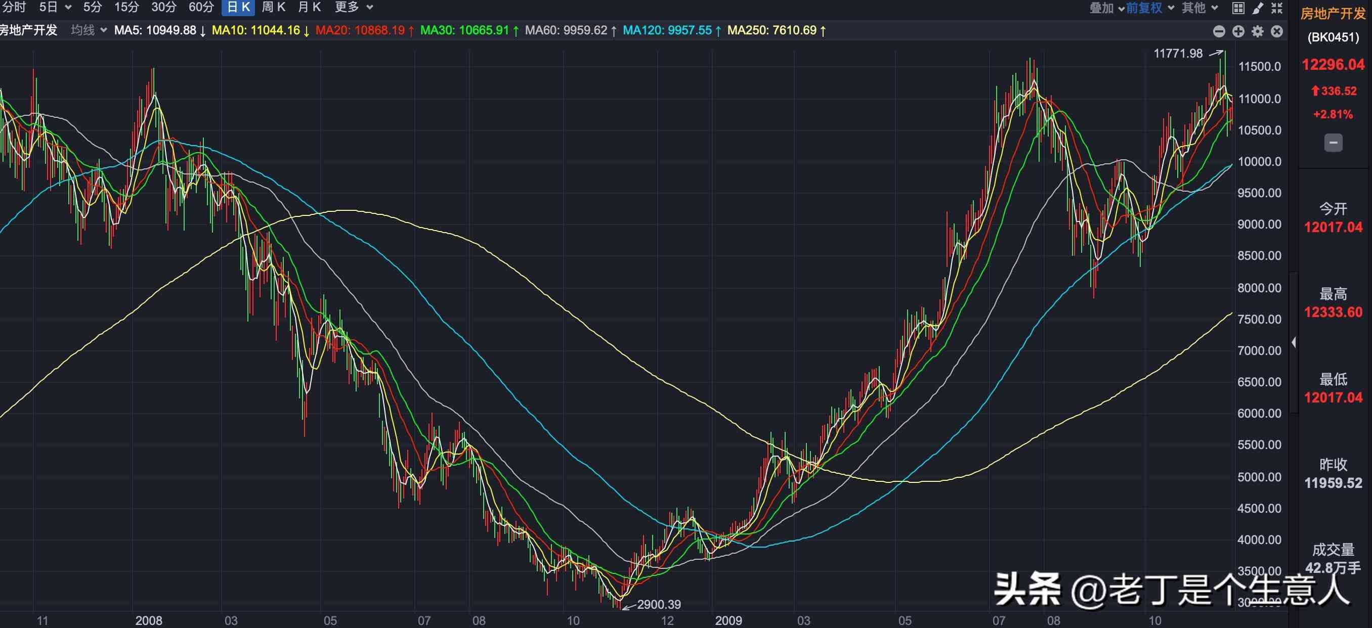 而房地产开发板块,则从低点的29.39一直涨到了11461.88,涨幅近四倍(如图)。