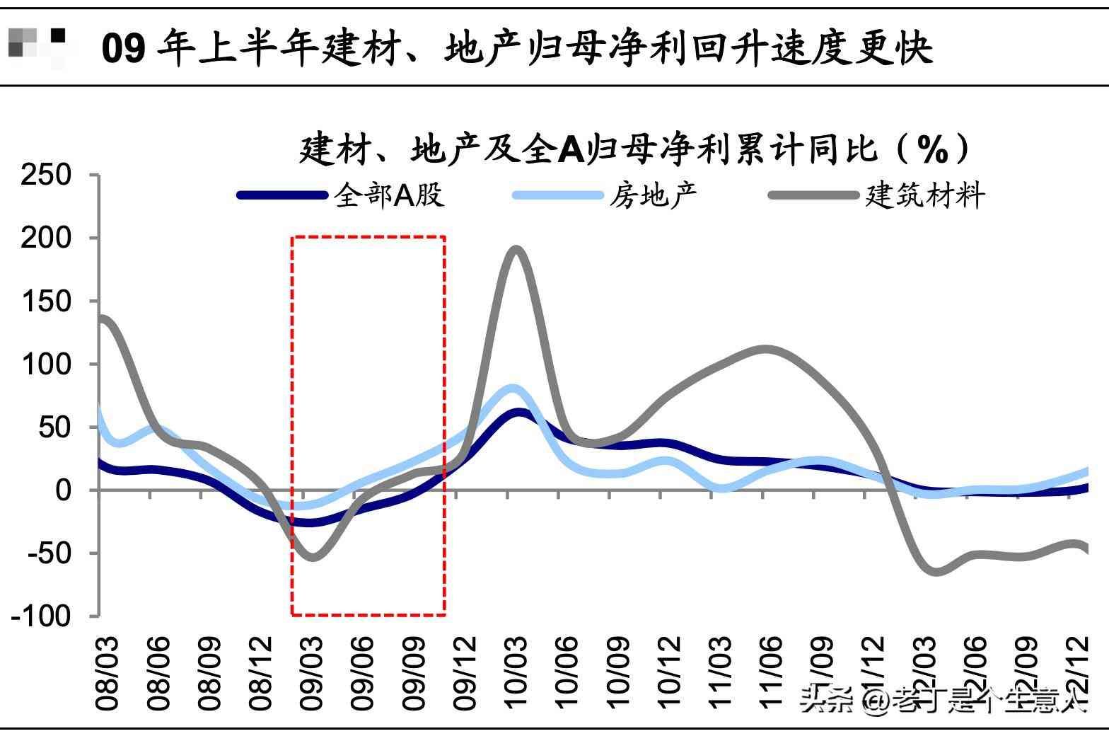 不过,全部A股公司的归母净利累计同比是一直到 29第四季度才转正的,而地产和建材板块从 29第一季度开始,改善幅度就明显大幅优于全部A股(如图)。