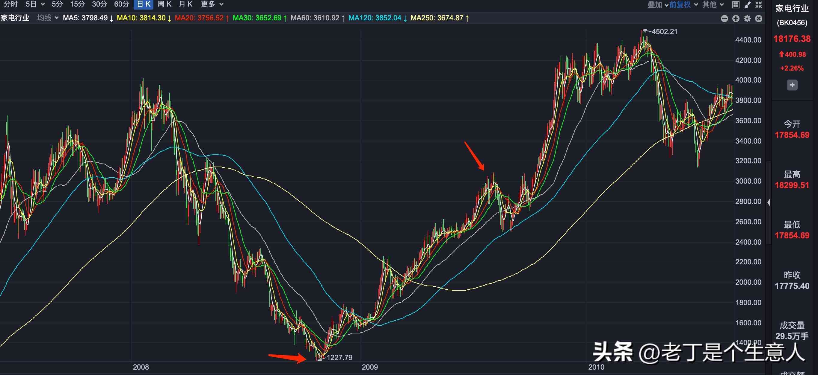从28年底到29年中这期间,四万亿的放水刺激之下,中国基建和房地产开始率先回升,在四万亿的投资计划当中,约有1.5万亿被投入到了基建当中。而且因为当时中国也正处在工业化和城镇化的高速增长当中,所以市场对于房地产的回升预期更为强烈,在民间认为热钱就是会涌入到楼市里。所以这些预期反应在当时的股市,也是房地产板块和基建板块出现了第一波的轮动效应。