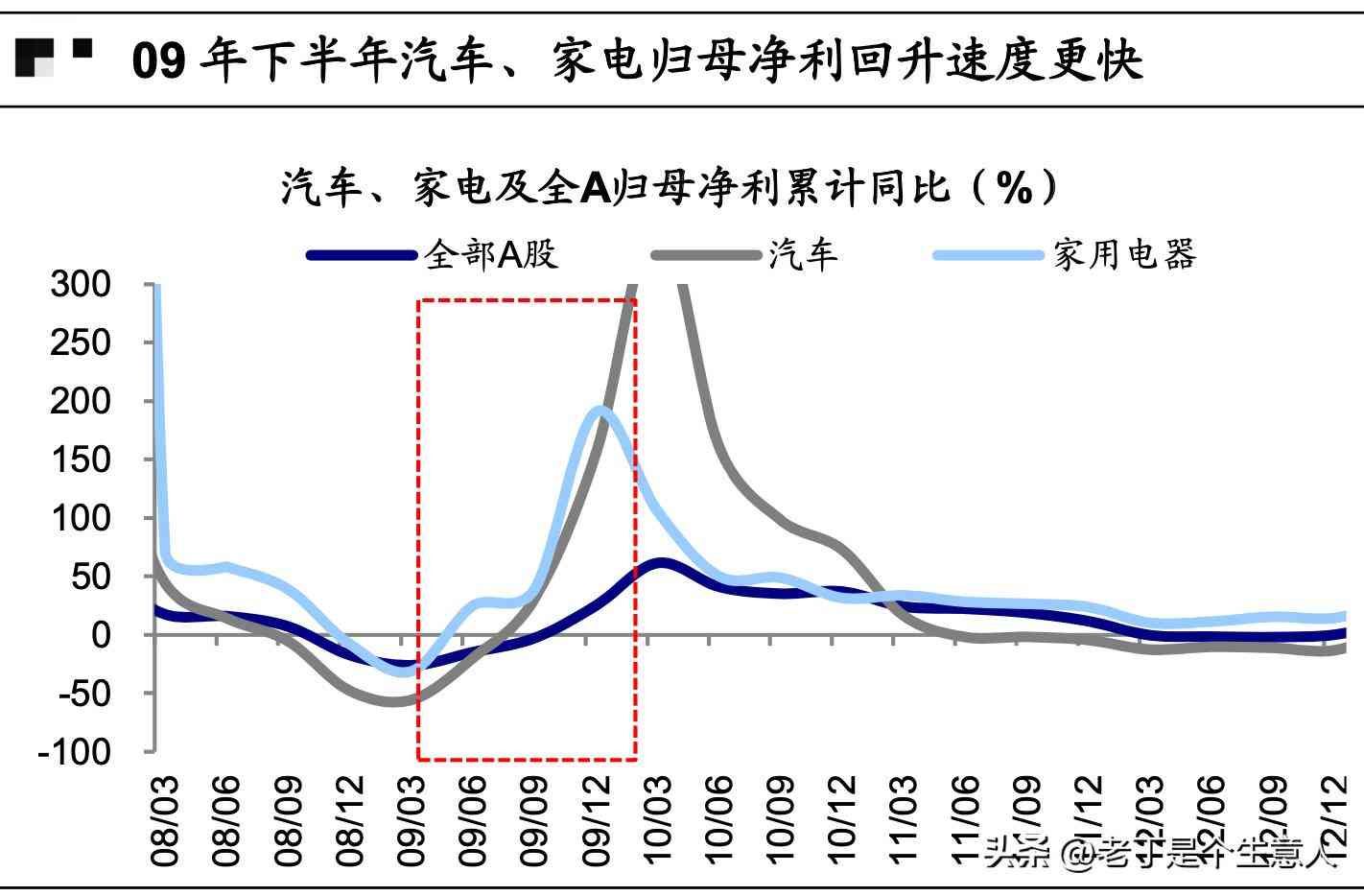 29年上半年财政部和国务院对汽车家电下乡提供了补贴,这一政策再伴随着此前的四万亿刺激,直接给相关行业带来了业绩改善。从29年3月份之后,汽车和家用电器的利润情况,明显好于全部A股(如图)。这段时间里,家电归母净利累计同比从 29一季度的-31%上升至 29四季度的191%,汽车从-56%上升至156%。