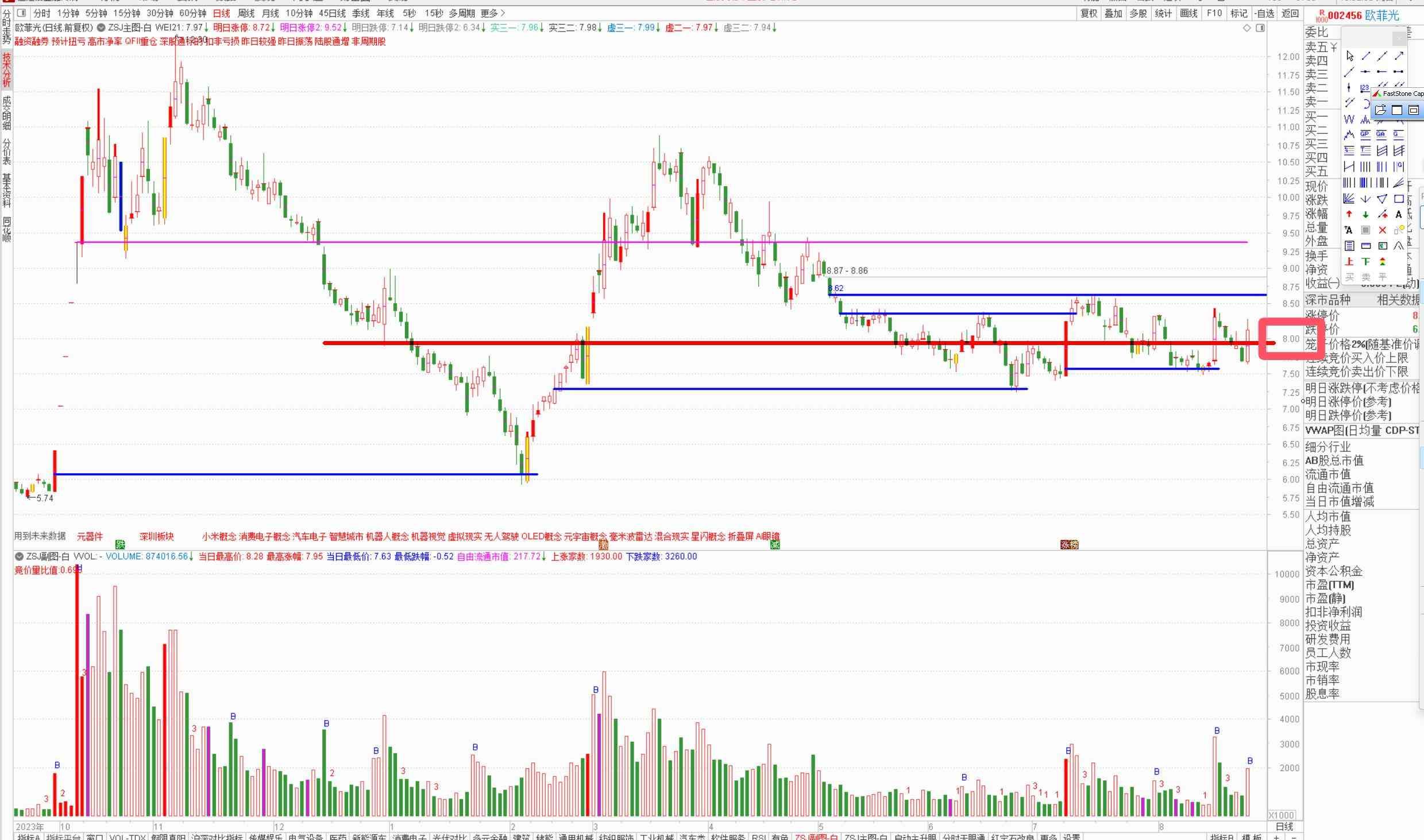 这里有一个方法,就是在主力吃货的区间内的股价,就是在低位时的股价。如欧菲光,应该以8元左右的股价计算其自由流通市值约220多亿,是属于大盘票。