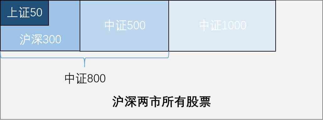 简单地说,中证1代表了A股排名801-18间的股票的整体表现,中证1与此前介绍过的几个主流宽基的关系简单示意如下: